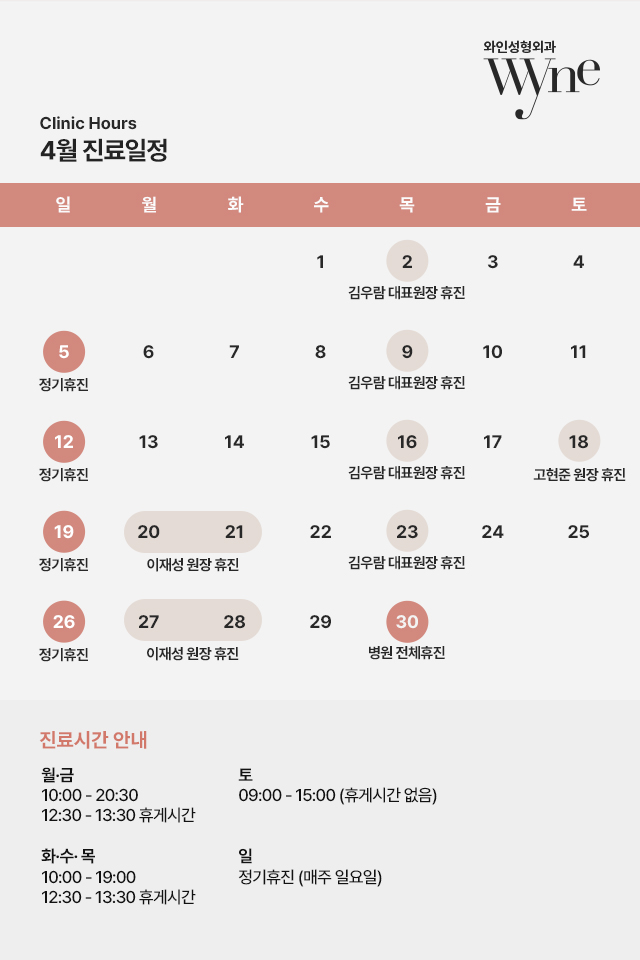 공지사항 WYNE NOTICE 2026-03-31 3월 진료일정2026-02-02 2월 진료일정2026-01-02 1월 진료일정2025-11-29 12월 진료일정2025-10-31 11월 진료일정