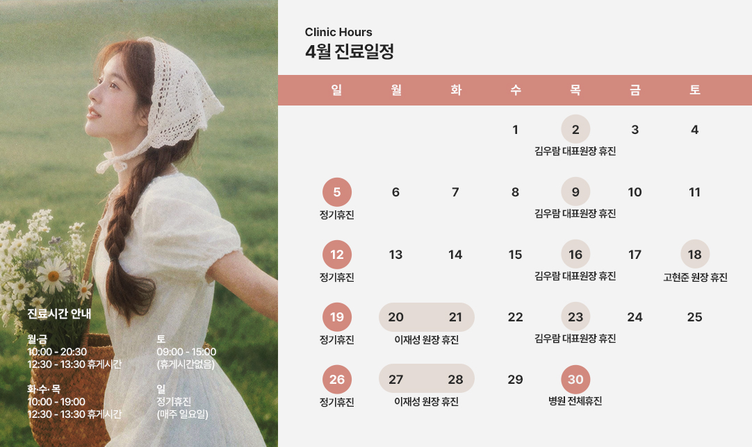 진료시간 CONSULTATION HOUR 043.259.6000 월 / 금 AM 10 : 00 ~ PM 20 : 30 화 / 수 / 목 AM 10 : 00 ~ PM 19 : 00 토 AM 09 : 00 ~ PM 15 : 00 점심시간 PM 12 : 30 ~ PM 13 : 30 토요일 점심시간 없음 / 일요일 휴진 카카오상담 바로가기
